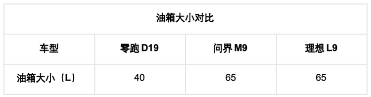 零跑D19配备的是40L的小油箱,而问界M9、理想L9都配备的是65L大大油箱,零跑D19虽然配备的是小油箱,但是精准的契合了日常的使用场景,平时用电,长途加油作为“兜底备份”,不仅减轻了车身重量,而且还降低了油耗,做到了一举两得。