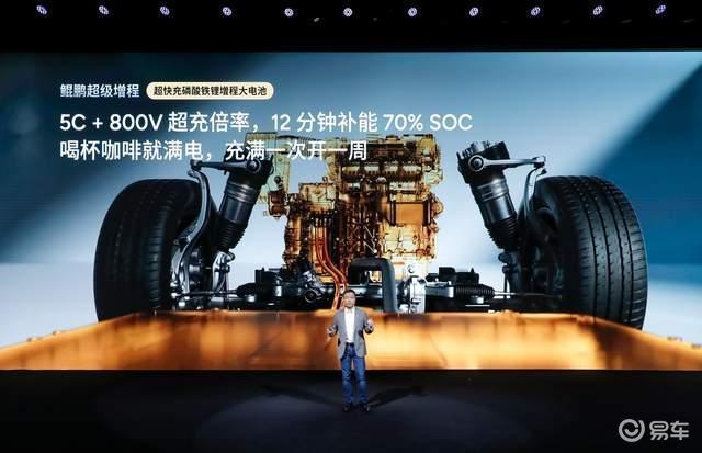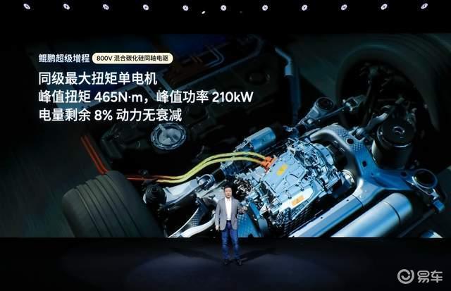 作为发布会核心,鲲鹏超级增程系统整合了小鹏多项自研黑科技,构建起 “高效发电、极速补能、全域适配” 的技术优势。其搭载第三代 1.5T 超静音增程器,配合全球首创 800V 混合碳化硅同轴电驱,CLTC 综合效率高达 93.5%,高压油冷发电机实现每升油发电超 3.6kWh,显著优于行业平均水平。