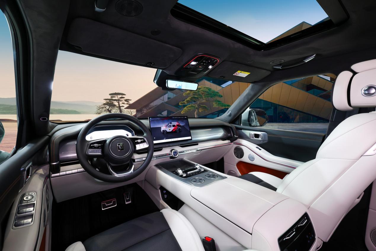 车色里最有灵魂的是敦煌青,取自敦煌壁画青金石原色,工艺对标超豪华品牌,细微划痕可自修复,长期暴晒也不易褪色,商务出门、进山越野都足够体面。车身近 5 米 1 长、超 2 米宽,坐姿高度接近 1 米,视野能轻松越过前车,开在路上气场完全不输百万级硬派 SUV。
