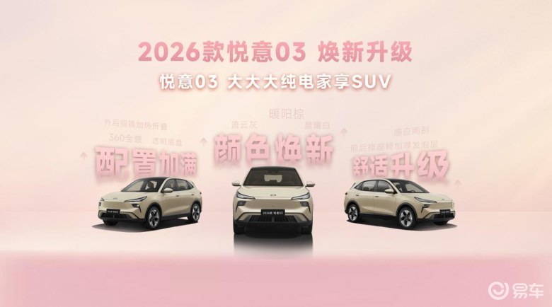 在外观方面,2026款悦意03新增“晨晖金”车色,主打柔和精致的视觉感受。内饰方面,新增“晨曦白”配色,搭配双拼纹理座椅,提升座舱整体质感。