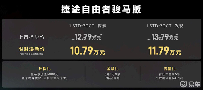 自由者骏马版也是如此,探索款售价12.79万元,发现款售价13.79万元,享受权益后的限时售价分别为10.79万元和11.79万元。而与之相对应的自由者普通版本——1.5TD 7DCT探索版售价12.49万元,1.5TD 7DCT发现版售价13.49万元。简单计算一下,自由者骏马版比普通版本便宜了1.7万元。