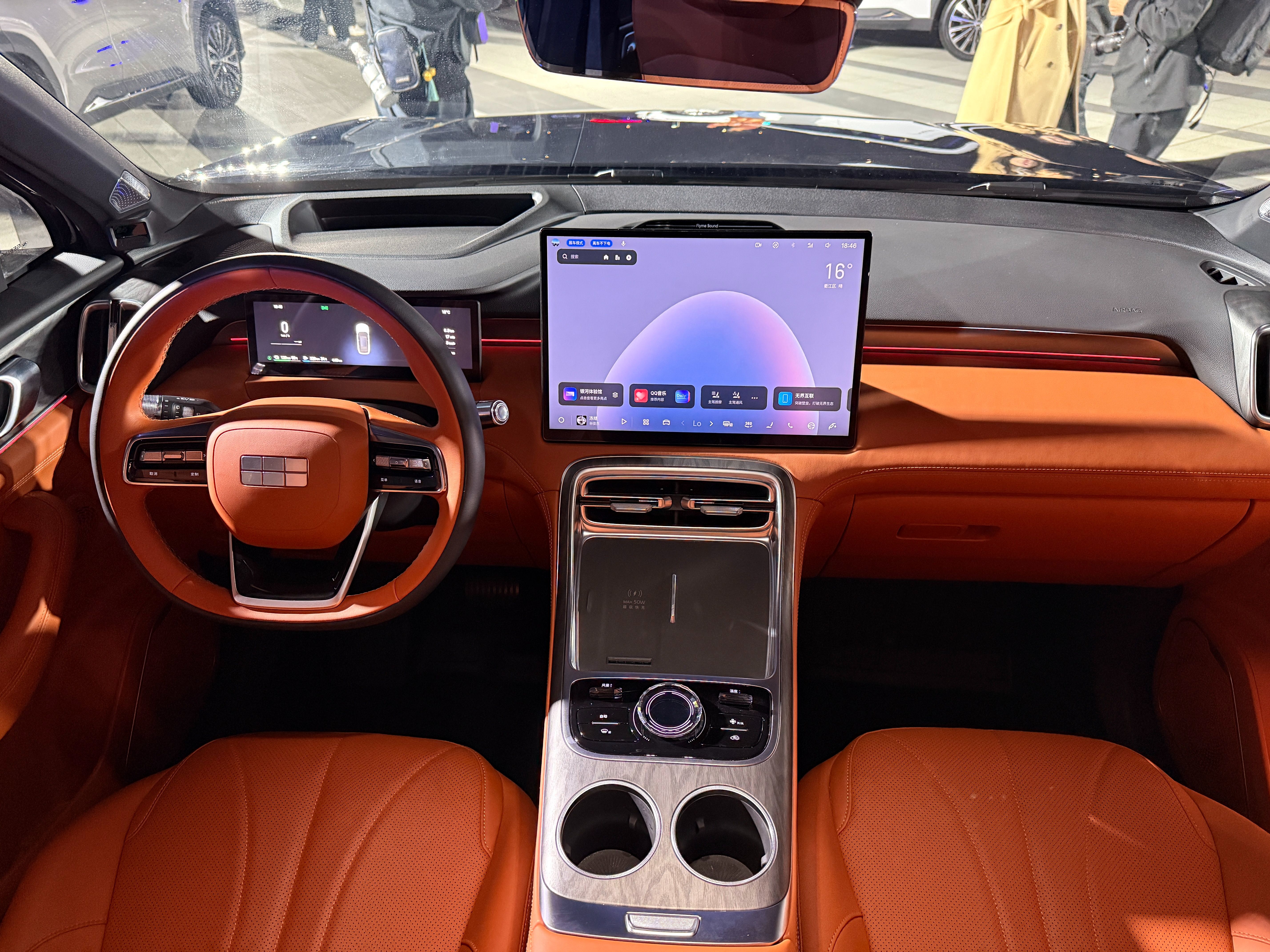 吉利银河M7的内饰设计则是现在很流行的简约风格,T型中控台的设计大家都很熟悉,做工用料很细致,整车软包面积达到了82%。车机系统使用的是Flyme Auto 2,中控屏尺寸为15.4英寸,语音交互系统依托星睿大模型可实现AI智能对话,新车还配备车外扬声器,可以对外播报系统预设好的趣味语音,也可使用自定义导入音频。新车在音响系统方面使用的是Flyme Sound 23扬声器+头枕扬声器,功放功率达到了2000W,支持7.1.4全景声道。