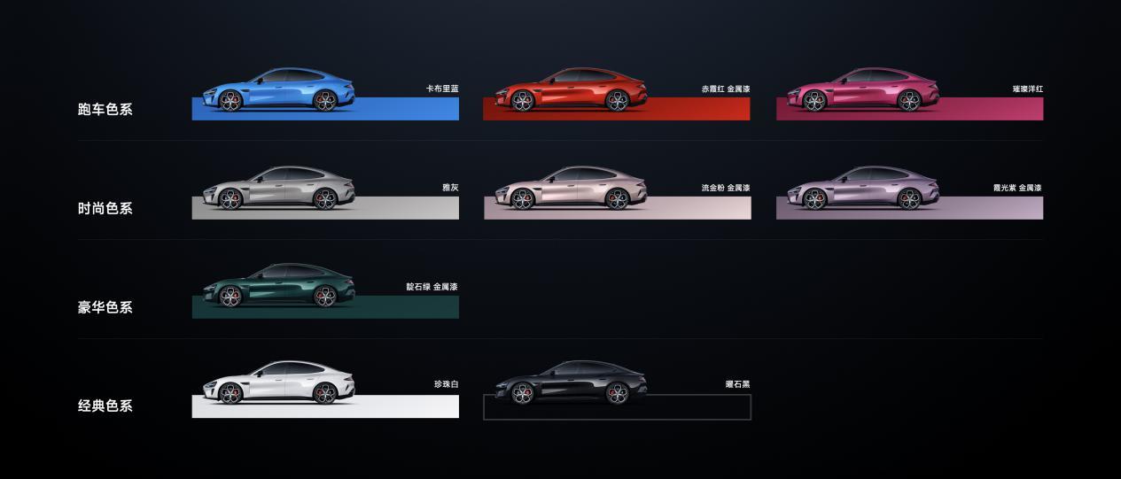 首先,在车色方面,新一代小米SU7依旧推出9款颜色,不仅保留了上一代SU7非常受欢迎的四款颜色:雅灰、珍珠白、璀璨洋红、霞光紫,同时延续了两款其他车系的好评色:来自Ultra的曜石黑、来自YU7的流金粉,除此之外,本次新SU7首发三款新颜色,分别是:卡布里蓝、赤霞红和靛石绿。