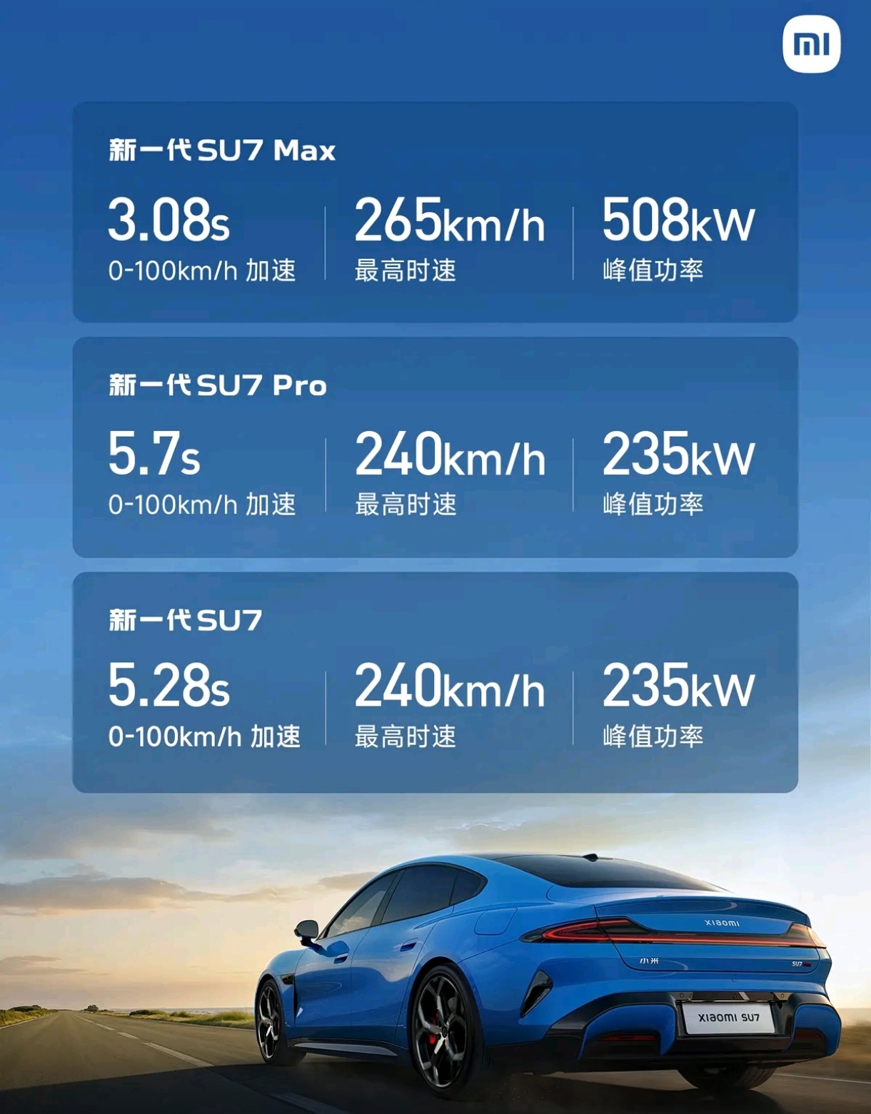 动力与续航方面,新款小米SU7全系搭载小米超级电机V6s Plus,最高转速达22000rpm,其中标准版和Pro版峰值功率235千瓦,Max版峰值功率288千瓦,零百加速仅3.08秒,最高时速可达265km/h。