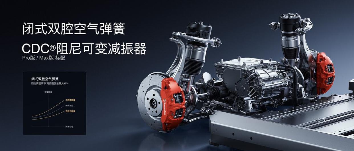 底盘与操控上,新车首发小米蛟龙底盘,全系配备前双叉臂+后五连杆悬架,Pro版和Max版额外搭载闭式双腔空气弹簧和CDC减振器,支持悬架软硬及高低四档调节,配合湿滑路面AI多模态识别技术,兼顾操控性与舒适性。同时,全系标配前四活塞卡钳及265mm后宽胎,进一步提升行驶稳定性。