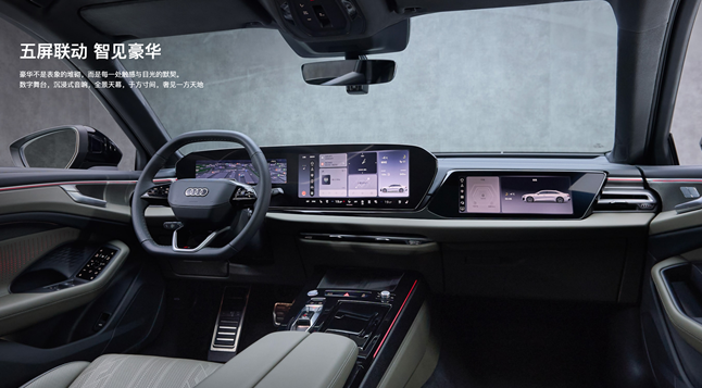 智能方面, 全新奥迪A6L展现了“在中国,为中国”的深度本土化决心。它深度定制了华为乾崑智驾®技术,与奥迪VMM整车运动管理模块协同,配合同级独有的双激光雷达布局,全面支持城区NOA、高速NOA等全场景组合驾驶辅助功能。由14.5英寸MMI全景显示屏、11.9英寸虚拟座舱、13.1英寸W-HUD等组成的五屏联动数字舞台,配合响应速度仅0.2秒的智能全场景语音助手,让科技真正服务于人。