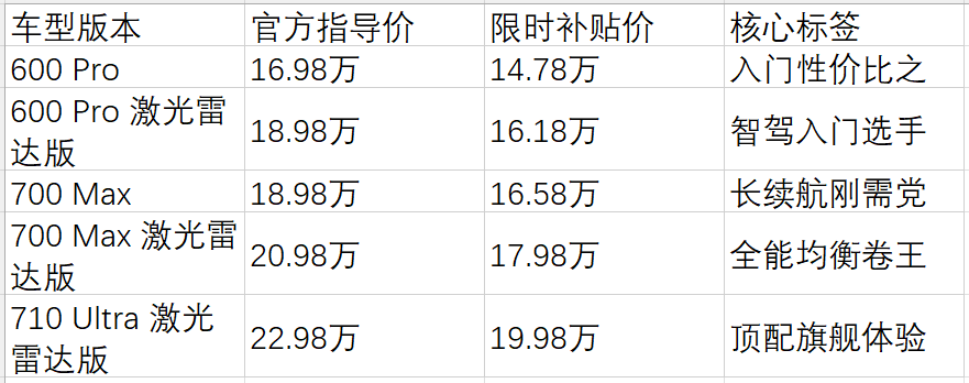 3、700 Max(补贴后16.58万)→ 长续航无忧的出行伙伴 核心特质:充电难题?选它轻松化解。舍弃智驾配置,专注将续航提升至700km,适配家中充电不便、频繁跨城出行且对智能驾驶无刚需的人群。续航扎实稳定,驾驶安心无忧,告别频繁寻桩的烦恼。